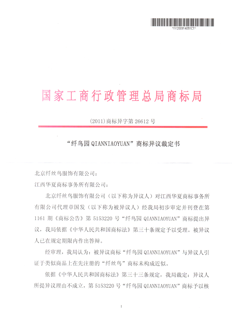 “纖鳥圖”商標異議裁定書