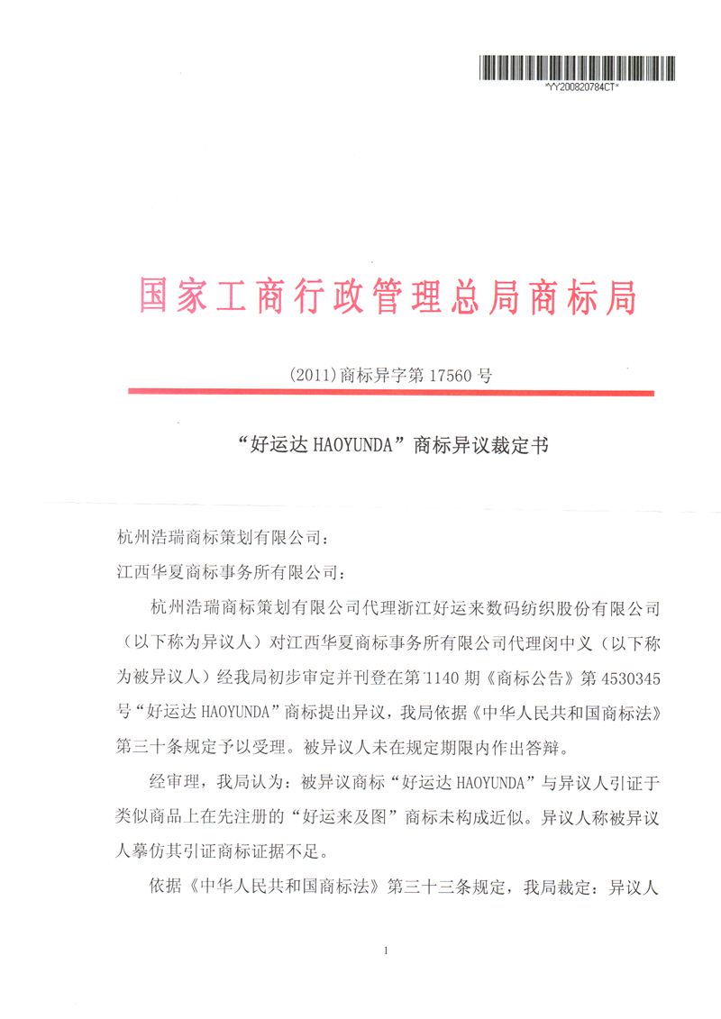 “好運達”商標異議裁定書